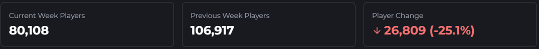 根据tracklock.gg的统计相比于上周,活跃玩家减少了11871人,下降12.9%,而相比于排位开始第一周下降了26809人,下降25.1%。无论这个游戏的前景如何,这么高的玩家流失率与V社最近几次的平衡补丁和对游戏机制的进一步调整密不可分,照此趋势下去,本周如果没有比较大的动作,玩家数量还会进一步减少。