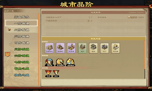 等到城市规模扩大,鸿野县就不再是「穷山恶水」。在达成一定条件后,「鸿野县」可以变成更高品阶的城镇,进阶的同时会面临新风险(如虫灾旱灾),但也会解锁新资源。