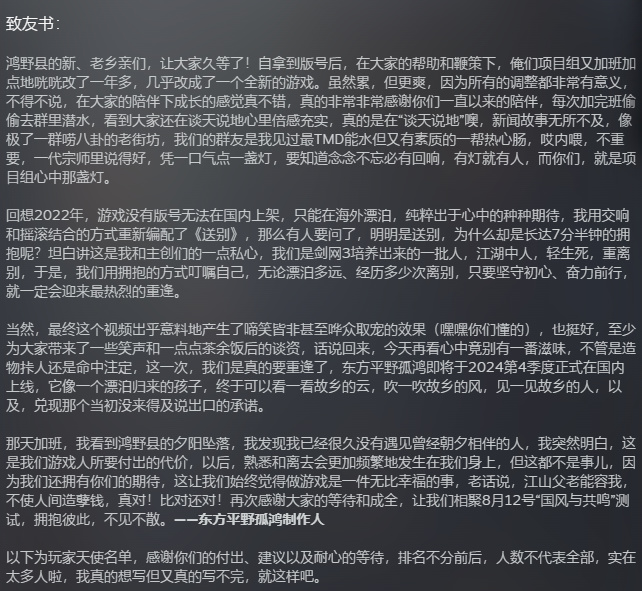 《东方:平野孤鸿》最早在2021年8月曝光。2022年11月在海外(海外区原定价约10美元)上线,在发售当天靠着一个魔性的宣传片收获了不少关注。该宣传片总时长共计八分钟,其中五分钟内容是各种各样的人物在不同场景当中进行拥抱。
