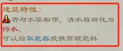 「建筑」两两之间会有一定的联动效果,例如「家禽场」会产生废料,如果临近「水渠」会将清水转化为污水,污水会增加疾病、畜疫的发生概率,但同时也能提高土壤的肥沃程度,直接提高粮食产量。