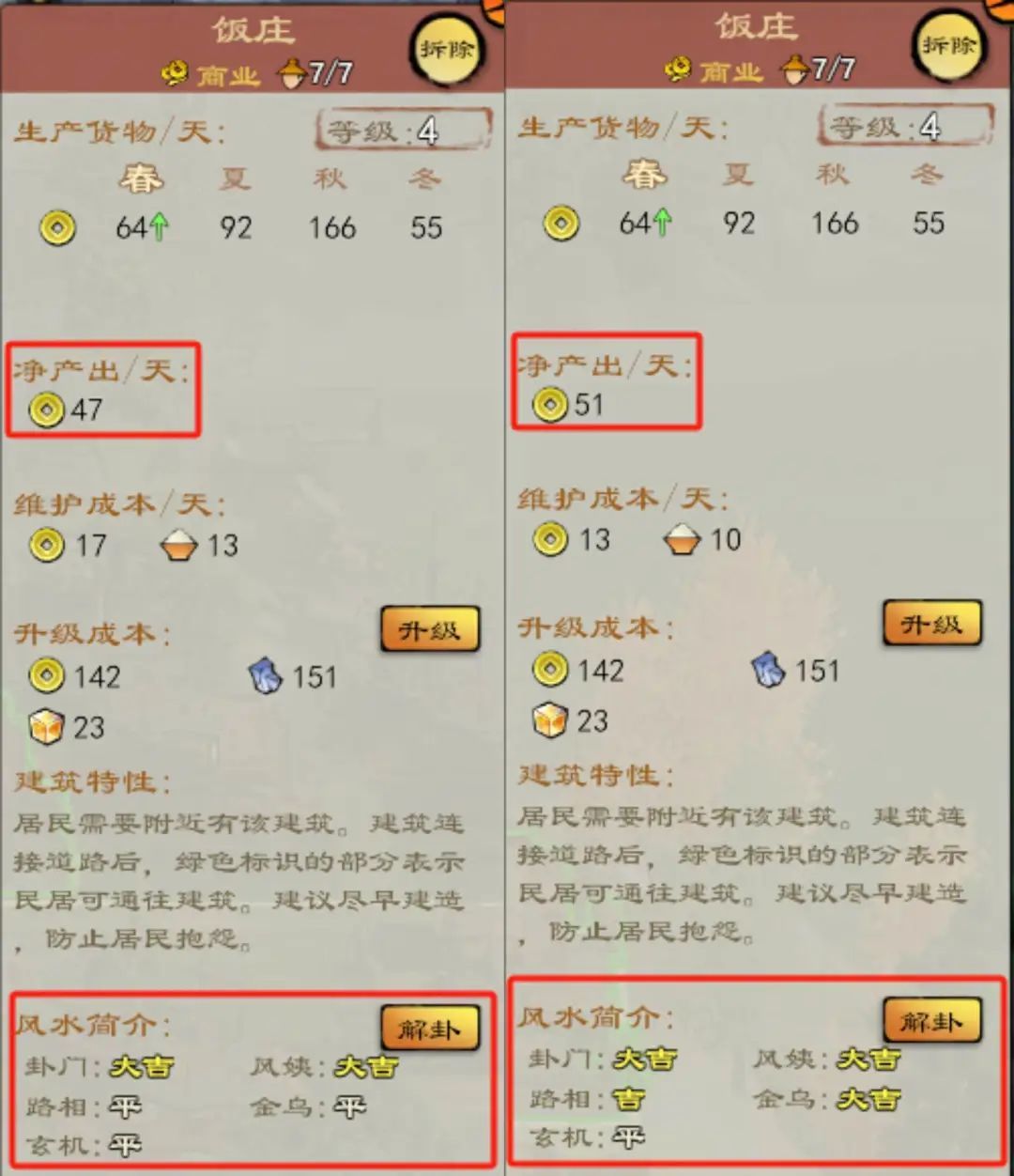 如果「建筑」契合「风水」,「建筑」的产出会直接增加,受灾也会减少损失,反之则会减少收益或者加大损失。