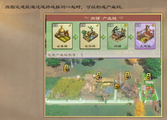 发展一段时间后,鸿野县已经温饱不愁,那就可以开始想想如何建设城市的问题。根据已有的「家禽场」和「小米田」,你顺势想到了「肉铺」和「炙烤摊」,这几种相互关联的建筑用道路连接起来,就成为了一条现成的「产业链」,上下游的「建筑」都能享受一定的加成。