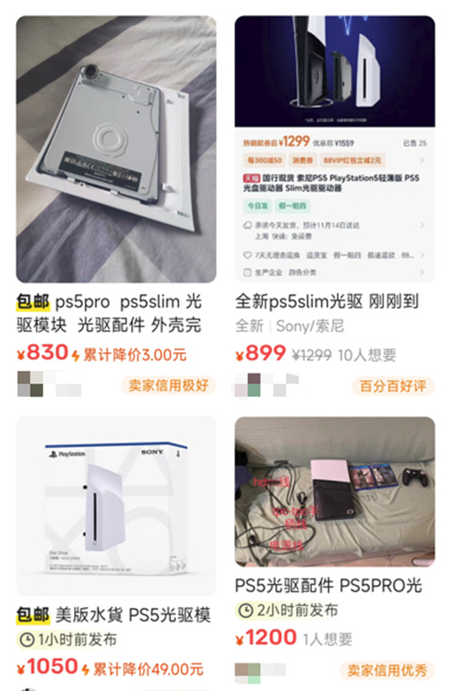 反倒是PS5 Pro的外置光驅,由於備貨量太少被黃牛們一掃而空,原價80美元(約合人民幣580元)的配件在國內的二手市場上被賣出了800元的高價,甚至仗着備貨少敢賣到千元以上的黃牛也不在少數,頗有當年PS5溢價一倍的風範。