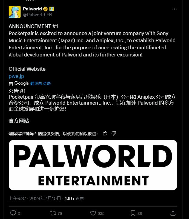 因为就在前不久,前索尼音乐、Aniplex与Pocketpair共同成立了一家合资公司。该公司将在索尼集团的协助下,协助《幻兽帕鲁》在全球的推广,以及进行IP内容的多元化,促进玩具、动画等周边的产生。