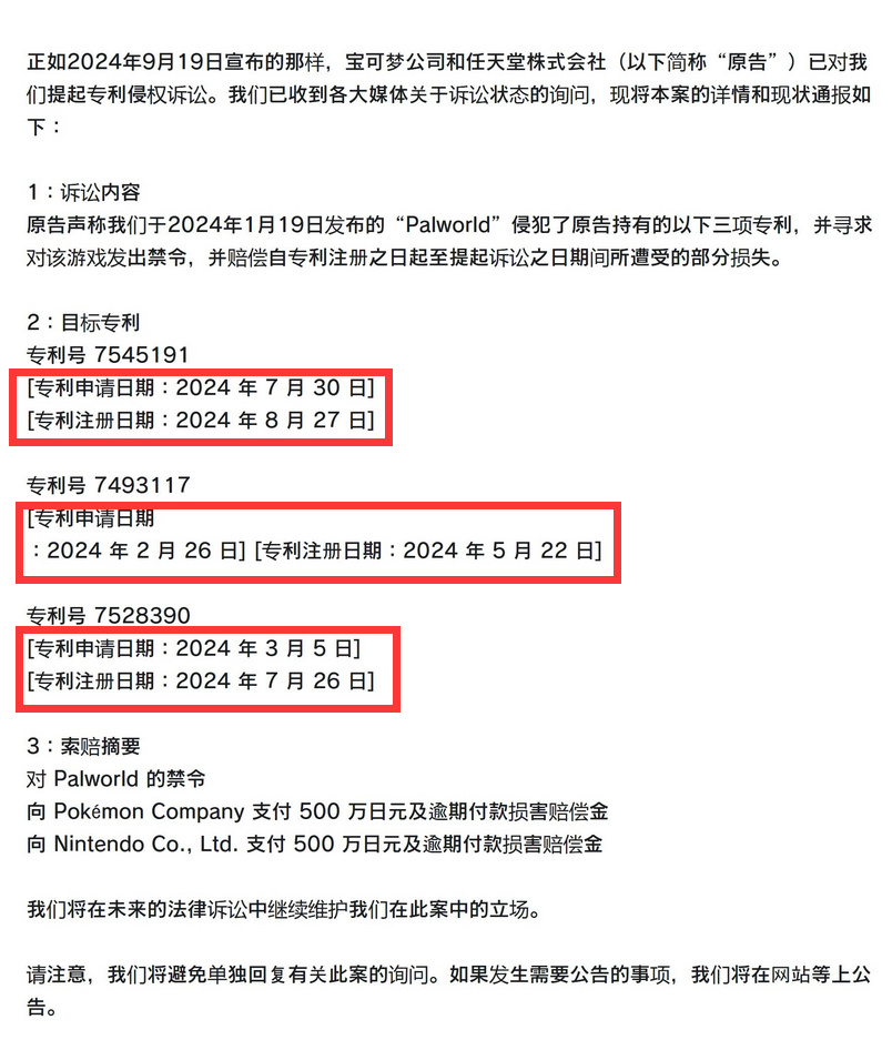 因为有大量玩家怀疑,任天堂在《幻兽帕鲁》发售后,专门跑到日本政府部门去申请了几条专利,并以“帕鲁侵犯了这些专利”为由提起了诉讼。事情如果属实的话,等于说老任伙同日本政府相关部门做假证来打压《幻兽帕鲁》,是赤裸裸的内幕操作+专利霸权。
