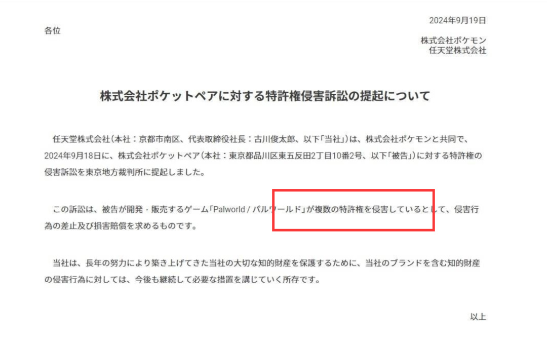 当时,任天堂与宝可梦公司联合发布了一份公告,指控Pocketpair公司开发的《幻兽帕鲁》侵犯了任天堂的多项专利权,并明确表示将采取法律手段来维护自身权益。