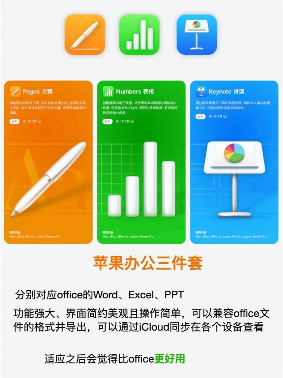 🏖Pages 文稿/Numbers 表格/Keynotes 講演 蘋果辦公三件套分別對應office的Word、Excel、PPT功能強大、界面簡約美觀且操作簡單,可以兼容office文件的格式並導出,可以通過iCloud同步在各個設備查看適應之後會覺得比office更好用