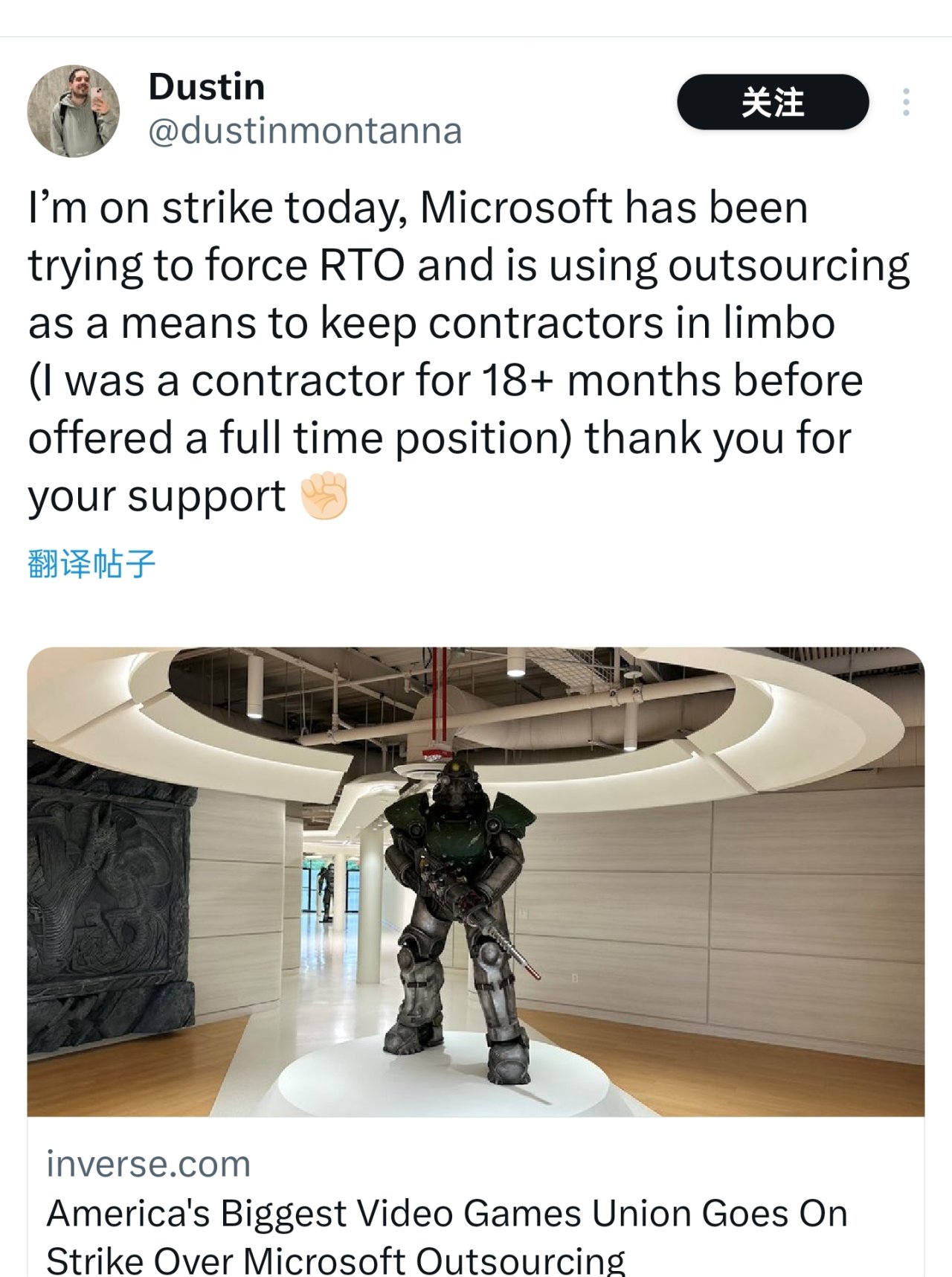此次罷工是繼去年1月ZeniMax Workers United-CWA成爲微軟旗下首個視頻遊戲工作室工會以來的首次大規模行動,該工會代表了馬里蘭州和德克薩斯州超過300名QA工人。