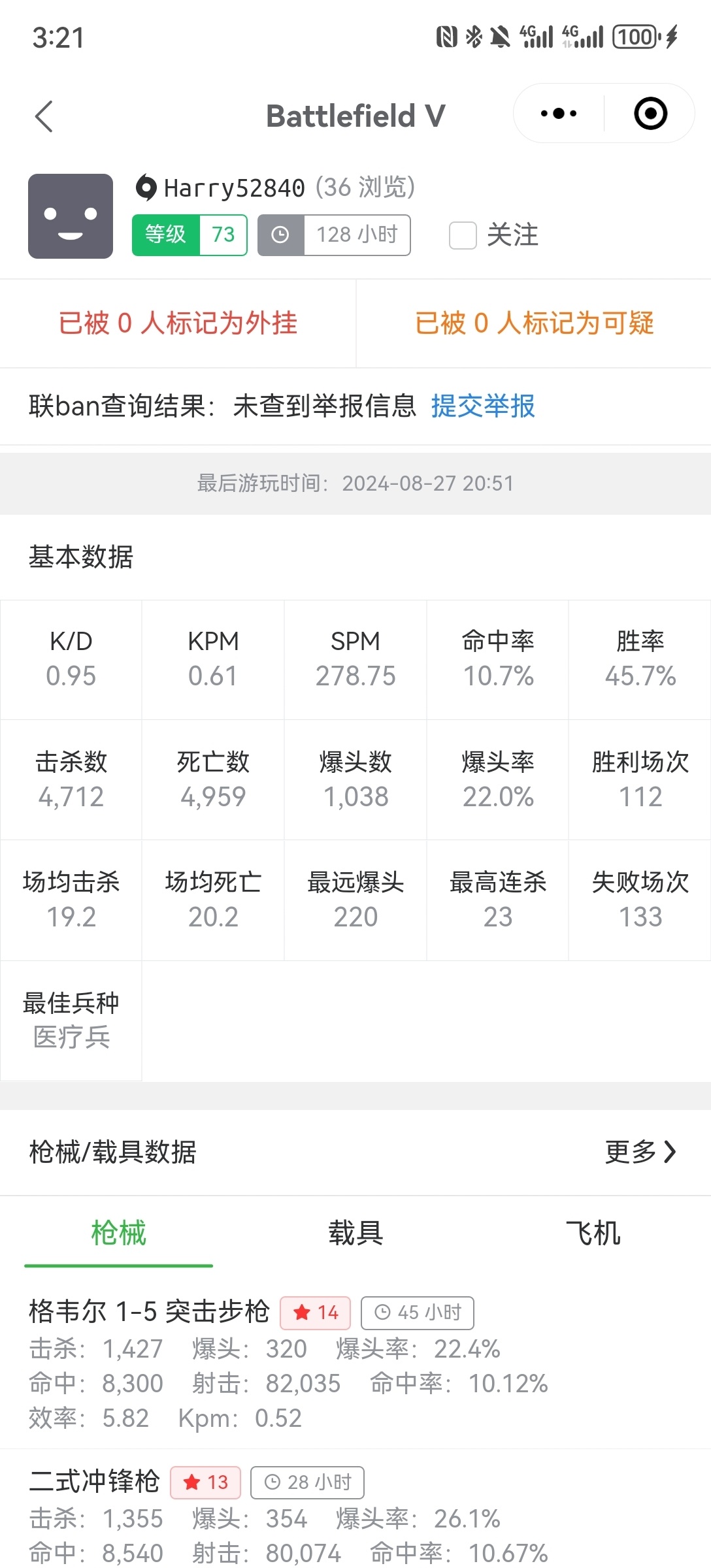 又打了100小时,只要不是一边倒,每局的kd这才到2,不过由于新手期还是太拉后腿,查询出来的数据并不好看。虽然打的还是新手服,但至少现在我能凭借着自己的技术从游戏中找到乐趣了。