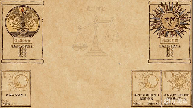 例如日屬性,就偏向於其他遊戲的力量屬性,影響暴擊,可以造成150%傷害;月屬性則類似於敏捷,可以影響先攻以及提供格擋,降低50%傷害;星則會提供護盾,或者在檢定中造成無視護盾的壓制傷害。