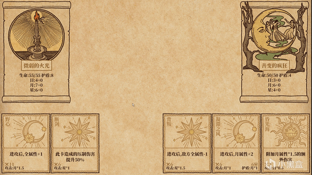 玩家牌庫的12張卡牌,根據日月星牌數量的不同組合,可以形成不同風格的屬性搭配。