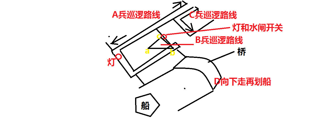 前半段只要等A兵走到c點(燈面前)即可划船走人,最高難度不僅要滿足A兵走到c點,同時圖中河對面那個兵必須向上走了才能劃,否則秒被發現。