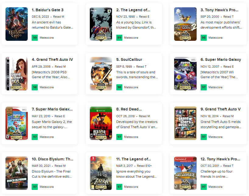 通過彙總各大媒體與玩家羣體的意見,其最終形成的分數很大程度上排除了一些偶然因素。在M站,80+遊戲即爲不可多得的佳作,90+遊戲往往是頗具開創性的神作,這樣的評分體系受玩家羣體認可度很高。