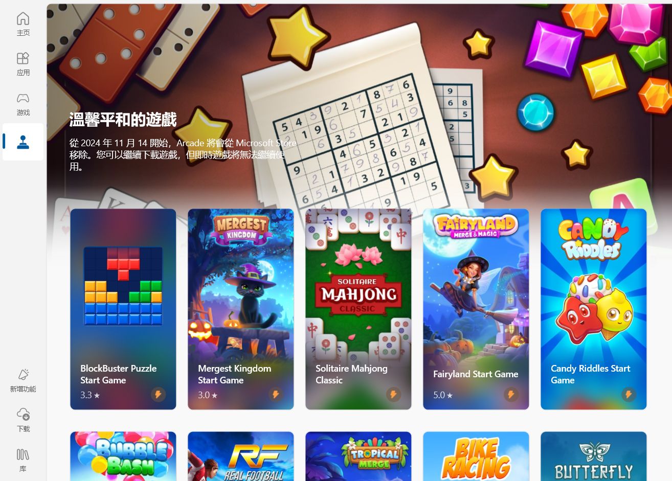 微軟應用商店公告稱:“從 2024 年 11 月 14 日起,微軟應用商店將移除 Arcade。玩家可以繼續下載遊戲,但即時遊戲將不再可用。”