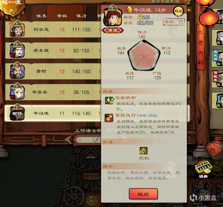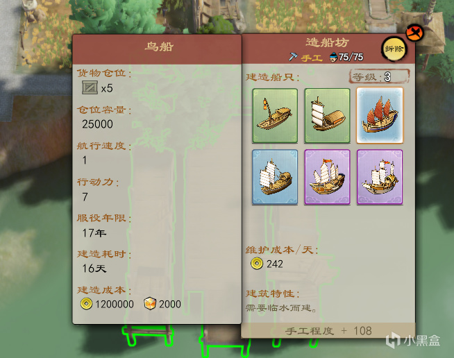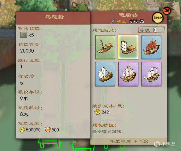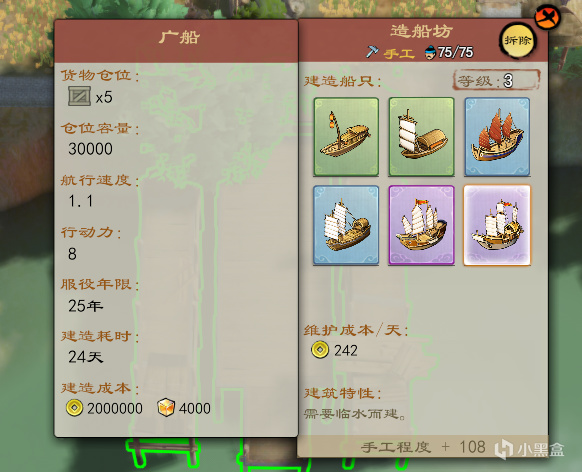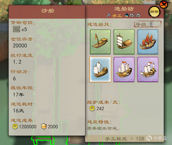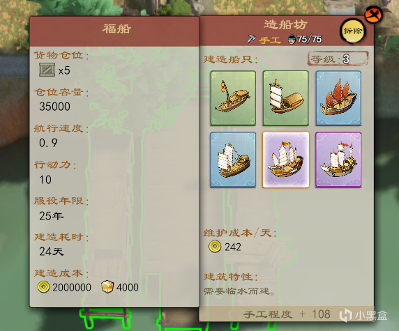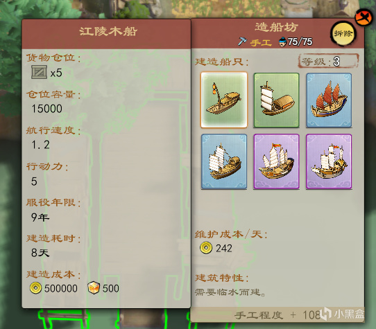 造船坊:造船坊跟港口一樣,整個遊戲也是隻有一個,在鴻野縣(初始地塊)過了小橋的那個位置。造船坊需要先讓港口完成收集10W資源的任務,解鎖港口貿易功能後才能進行重建。重建造船坊後可以在裏面建造船隻,總共有6種船隻可以建造,分別是江陵木船、烏篷船、鳥船、沙船、福船和廣船,其中福船和廣船,需要將城市提升到十一階,並且造船坊升到3級纔可以建造。每一種船的屬性都不一樣,建造的成本也不同,可以按自己的喜好來選擇建造。如果覺得造船成本有點高的話,可以任名謀士牛漢斌,他的被動技能可以建造20%的造船費用。