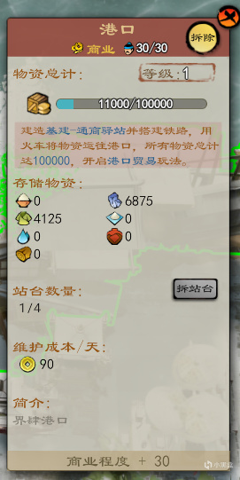 港口:港口整個遊戲中只有一個,位於鴻野縣(初始地塊)的中心,地塊中自帶鐵軌的位置。升到十階城市後可以點擊港口進行重建,港口自帶一個站臺,可以通過營造坊建造擴容至四個,重建港口後會解鎖出口貿易功能,在左邊的功能欄中可以使用。剛重建的港口會提示收集10W物資,需要通過驛站發送列車運送物資到港口。