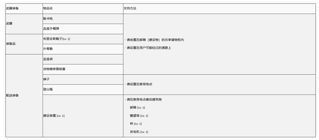 放置支援物品! 请在东部地区放置装备、武器和配送设备,或使用 lv1建筑设备建造建筑物。