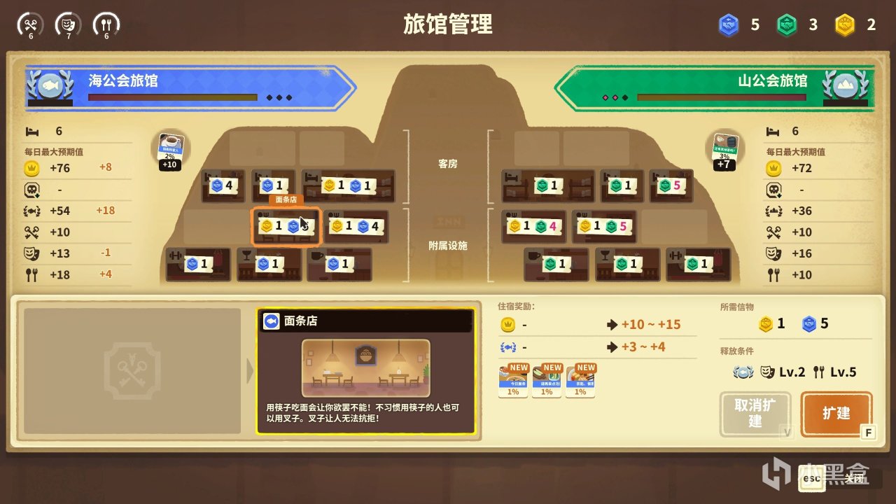 從梅加入開始,對於旅館建設你需要考慮的也更多了,那就是任務和通關計算都會出現黃色貨幣——旅店的高級改造基本都會需要黃色貨幣,不過升級隨時可以回退,但是可以自由搭配在開張之間達成最強“戰力”,不過目前旅店各項設施對應的效果對於玩家來說會比較“黑箱”,感受不到直觀的效果和反饋。