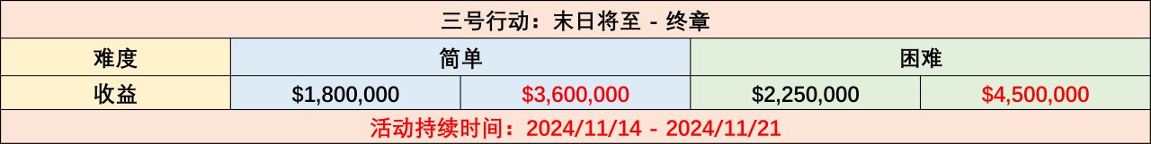 在時隔一年後,M3 終章如約帶着雙倍報酬迴歸,流程極其固定,四百五十萬報酬、雙人配合,這就是本週最賺錢的差事,比辛辛苦苦拉特種貨物簡單多了。若選擇困難難度進行遊戲,要比普通難度多賺近百萬,建議直開困難。