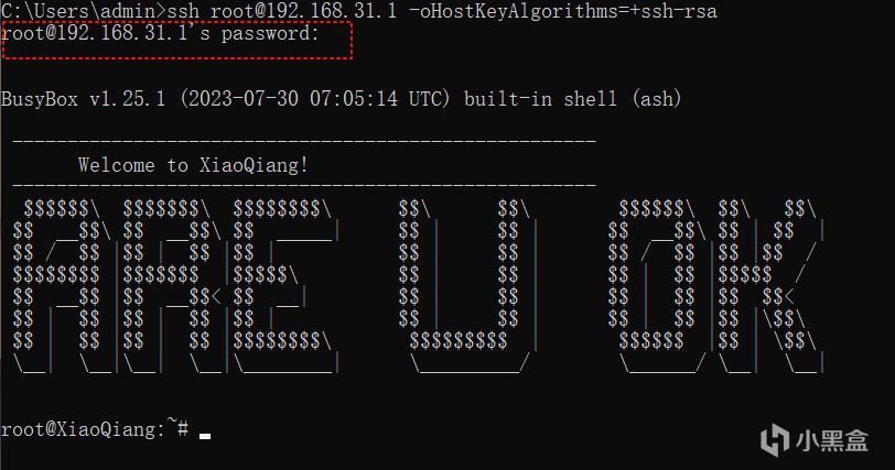 如果一切順利,你可能會看到root@192.168.31.1's password:,在這裏輸入root密碼,默認密碼爲root,密碼輸入時不可見,然後回車。