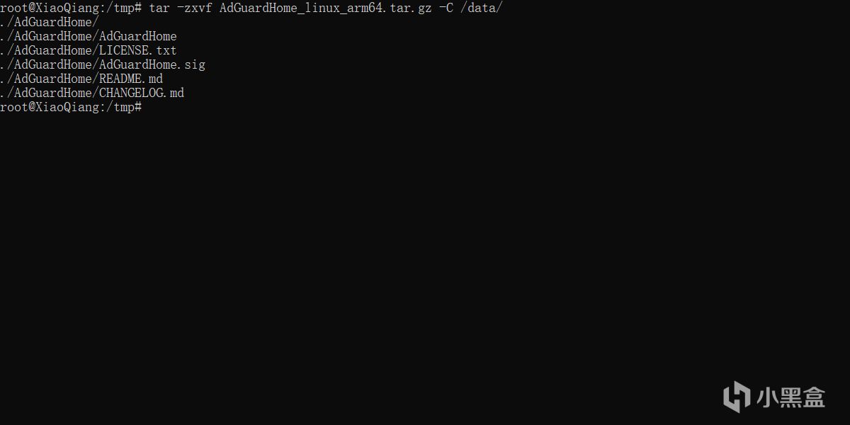然後我們將下載下來的壓縮包解壓到data目錄,在ax3000t中,data被掛載在flash中,而其它大部分分區被掛載在內存中,斷電後丟失,使用tar -zxvf AdGuardHome_linux_arm64.tar.gz -C /data/