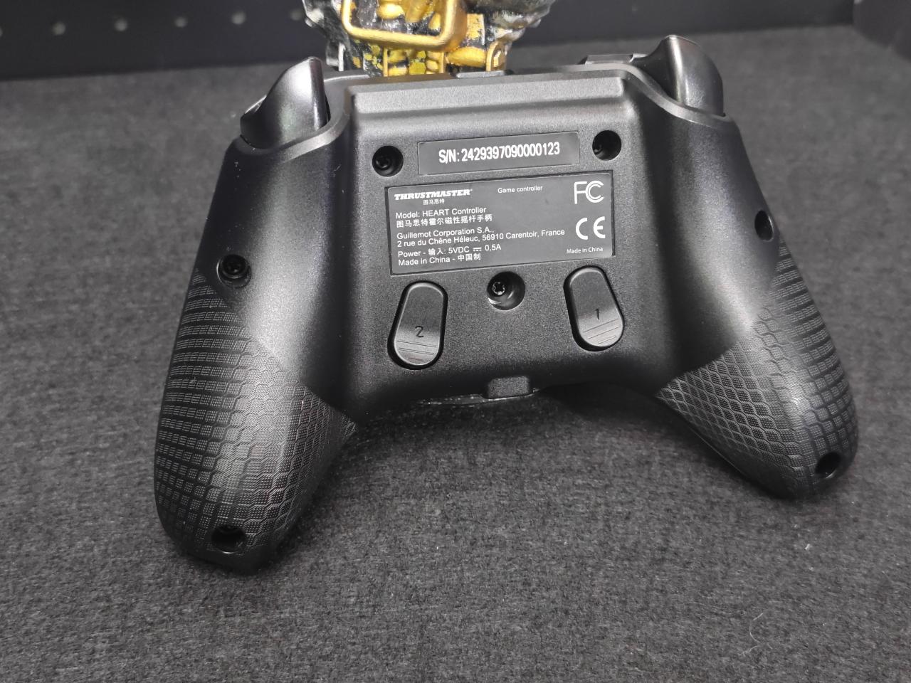 手柄背面共有兩顆背鍵,背鍵設計與ESWAP S Pro一樣。雖然比ESWAP X2 Pro好按,但是總體還是差那麼點意思。雙背鍵的方案個人覺得還是坐在握把處最完美。手柄背面握把也有激光防滑紋理,多區域的防滑塊,使得HEART的總體防滑性能非常不錯。不過如果可以把七個螺絲孔給堵住那就更完美了。