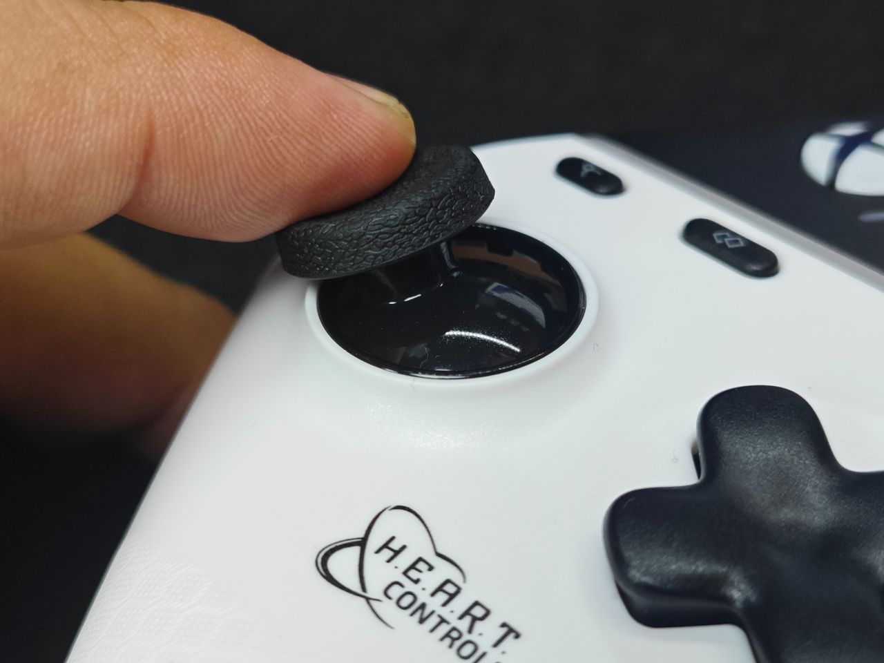 相較於圖馬思特此前的ALPS搖桿,HEART搭載的霍爾搖桿中心會比較緊,初始推動會有點喫力,但是推開之後就非常順滑。這樣設計雖然能夠帶來更好的回中能力,但是長時間使用手柄也會更加容易疲勞,特別是力氣比較小的女生。手柄搖桿外圈做有pom環設計,不僅能爲搖桿帶來更高的壽命,還能帶來更加順滑的打圈體驗。