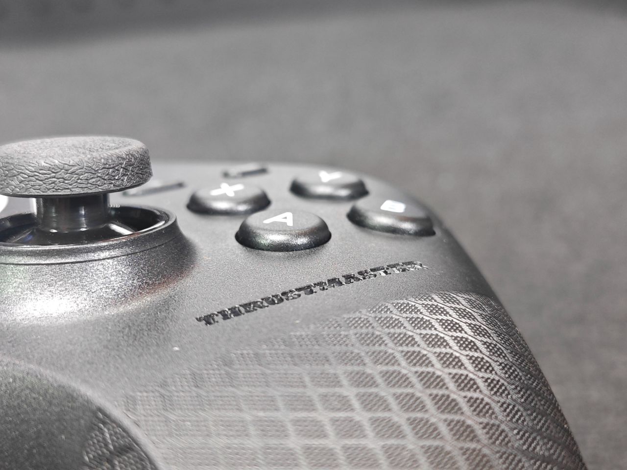 HEART手柄設計非常時尚,正面殼採用了熊貓配色,左邊是白色區域,右邊是黑色區域,中間有一條可變換顏色的燈帶。十字鍵左側印着手柄的型號“HEART CONTROLLER”。右側動作鍵下方則是採用刻蝕技術雕刻出圖馬思特的英文名。手柄正面握把處還做了激光點陣防滑處理,防滑紋理並不會很深,只是起到輔助防滑作用,對於掌心經常會流汗的小夥伴來說非常友好。