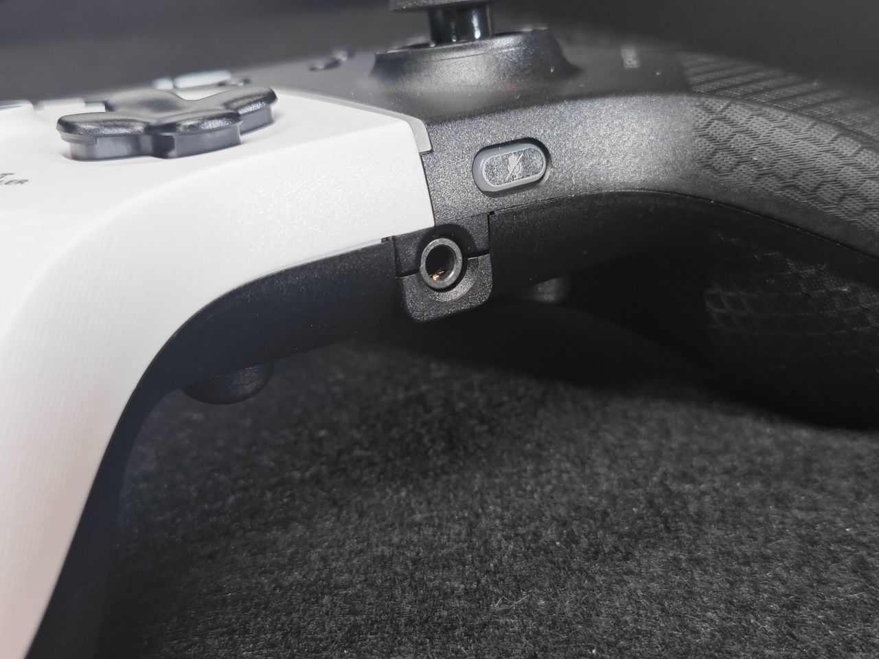 手柄底部有一個3.5毫米耳機接口及閉麥鍵,在連接耳機之後按閉麥鍵,按鍵燈光會亮,狀態辨認非常清晰。3.5毫米接口位置做工比較一般,連接處接縫比較大,雖說不影響使用,但是美觀性上略差,希望官方後續可以增強一下細節。