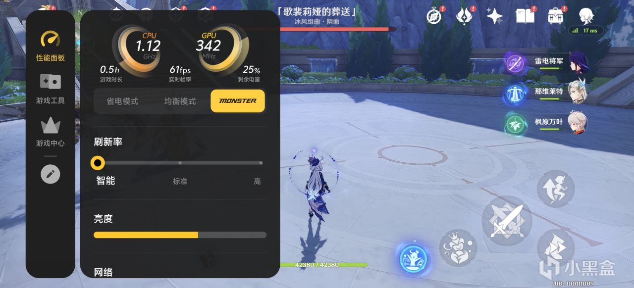 首先是性能面板上面可以更改三種模式:省電模式、均衡模式和MONSTER模式,刷新率可以從智能、標準和高刷三檔模式可改。