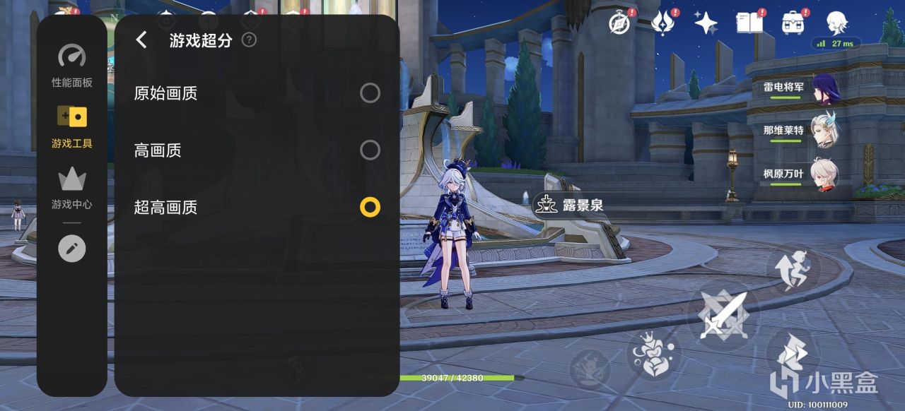 遊戲超分,開啓後增強畫質,有原始畫質、高畫質、超高畫質三種可選