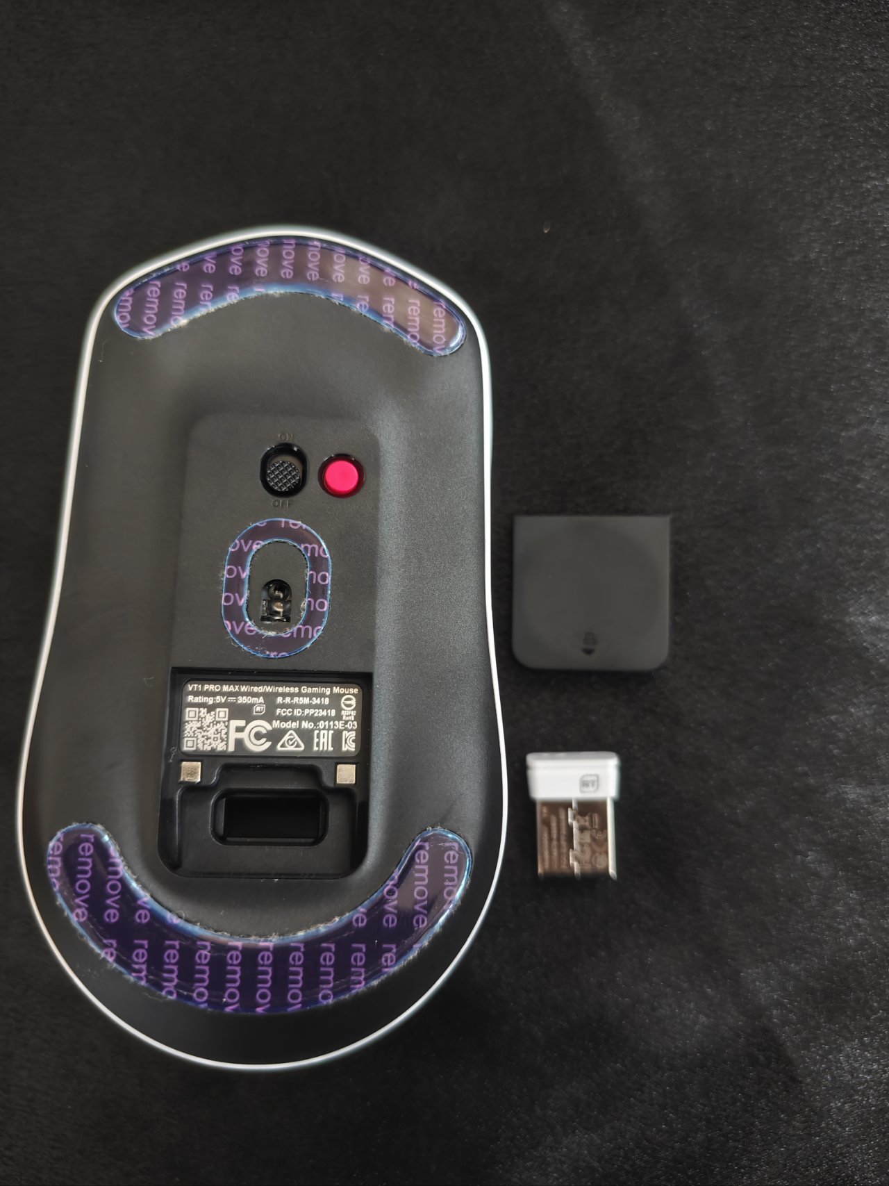 鼠标的背部沿用了之前的VT9PRO的样式,布局简洁。刚拿到手他就已经帮你贴上了特氟龙角铁,能很好的提升鼠标的顺滑度,这种不需要我动手贴脚贴的设计也是相当用心了~