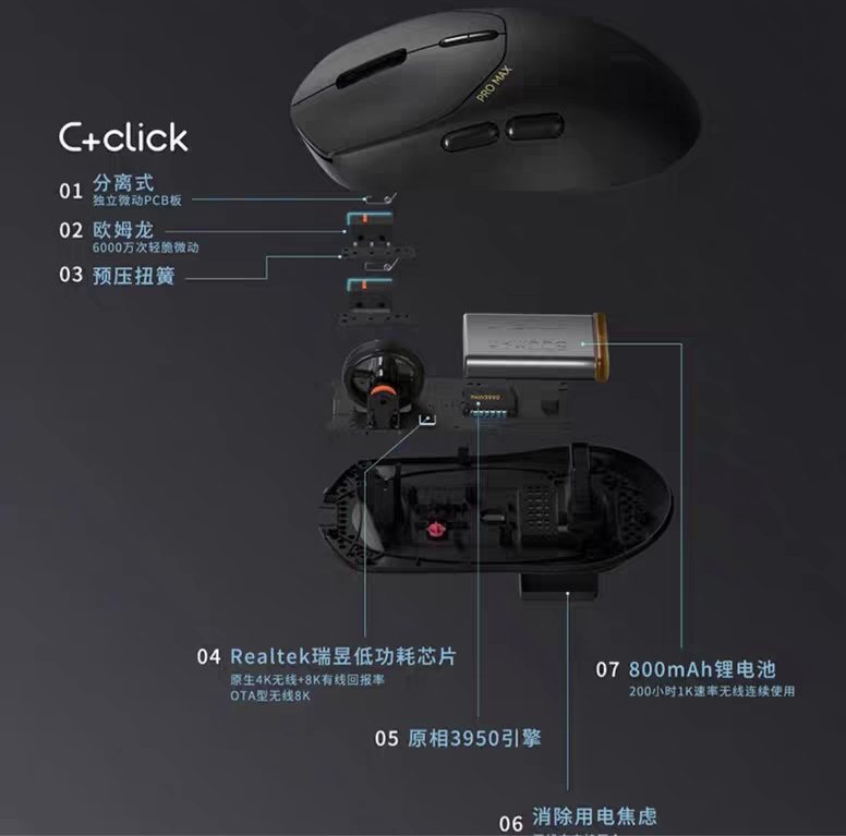 鼠标采用雷柏自研C+click分离式按键预压校调技术,解决了握法不同导致的按键触发回弹手感不一致的问题,做到了点击按压轻松,拥有清脆的回弹反馈的效果,使用起来有很强的手感,爱不释手。