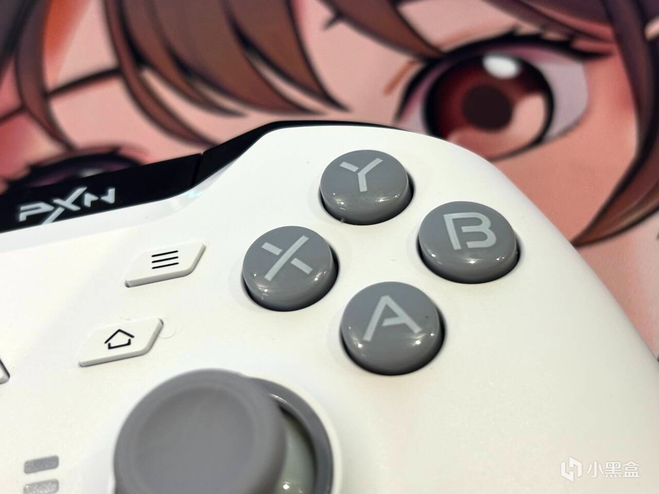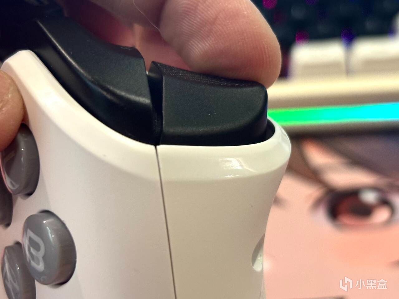 扳機使用的是霍爾電磁扳機,觸發精度爲0.05mm,手感還是比較舒適的,最值得一提的是,它居然還有一個兩段式的扳機鎖,可以通過切換線程的長短,把扳機從線性狀態改爲快速扳機模式,用它玩賽車遊戲的時候就用線性扳機,按壓的阻感就像踩油門一樣,而玩射擊類遊戲的時候就切換爲快速扳機模式,反饋感強而且通斷迅速,肩鍵則是輕觸開關材質,依舊是手感軟彈舒適。
