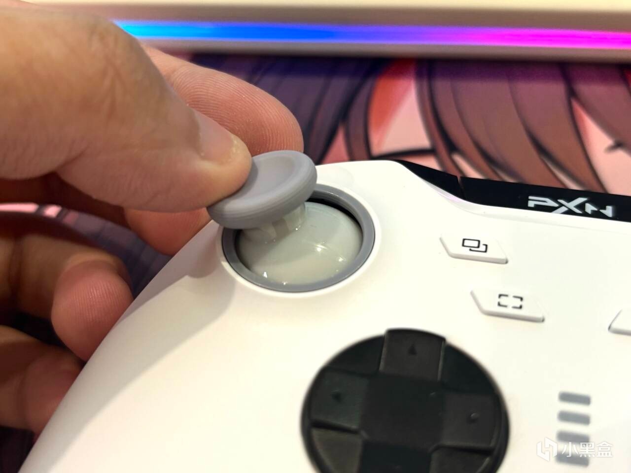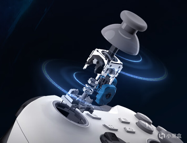 先來看看搖桿方面,使用的是霍爾搖桿,上面帶有POM環,可以說是非常順滑,600萬次的壽命,不僅死區爲零,漂移的概率也爲零,搖桿帽則是使用的硅膠材質,不僅手感舒適,而且也不會打滑。