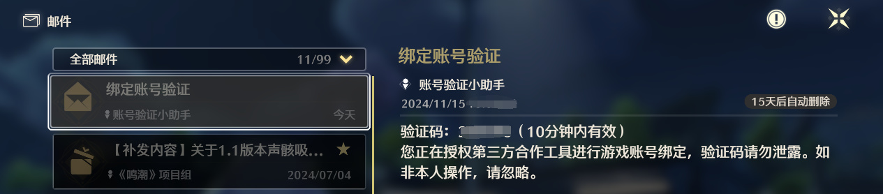驗證碼會發送到遊戲內郵箱,可能會有些許延遲請耐心等待幾分鐘(驗證碼有10分鐘有效期)