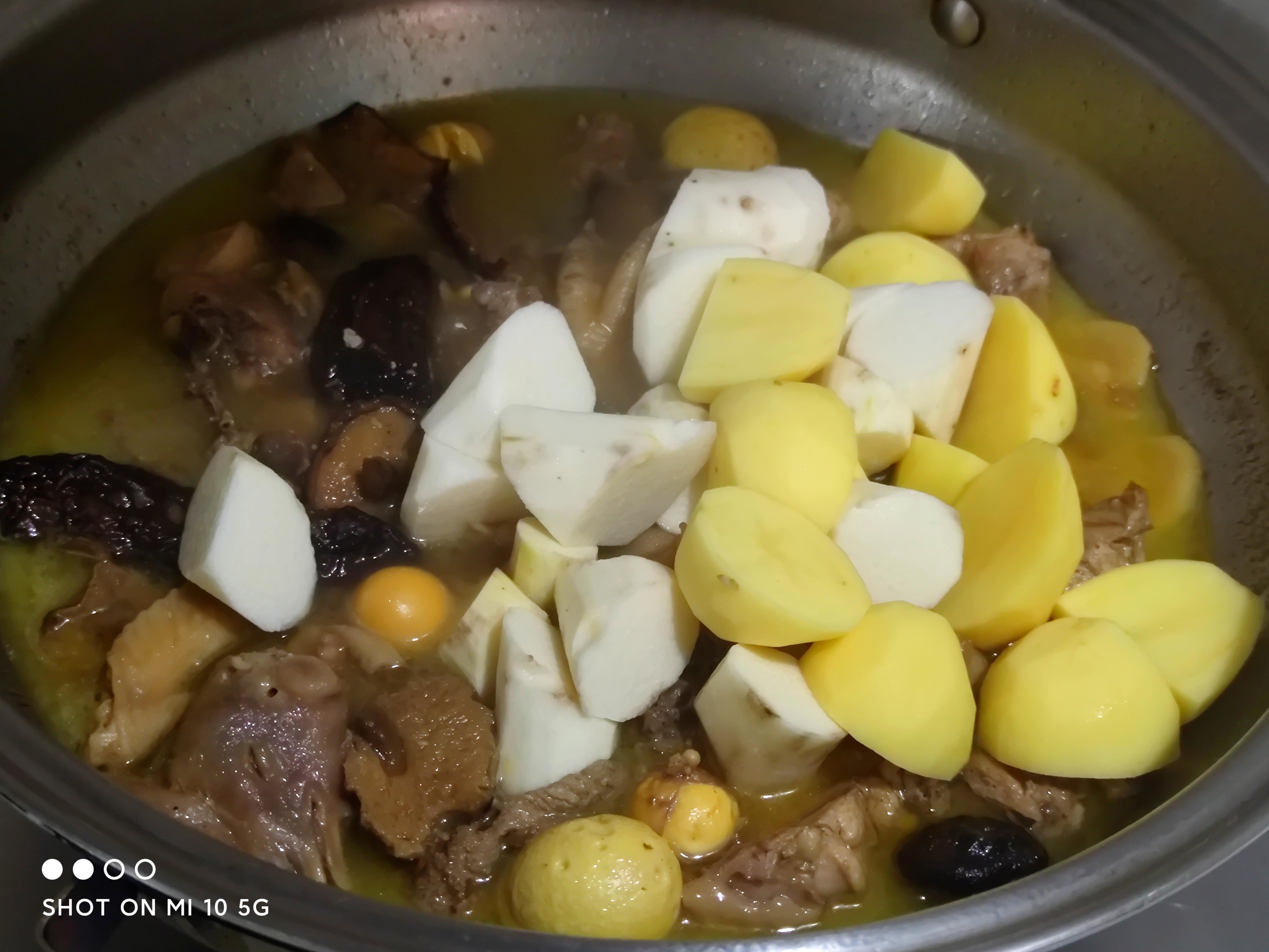 20分钟后,加入山药和土豆,效果慢炖20分钟,炖至土豆绵软。