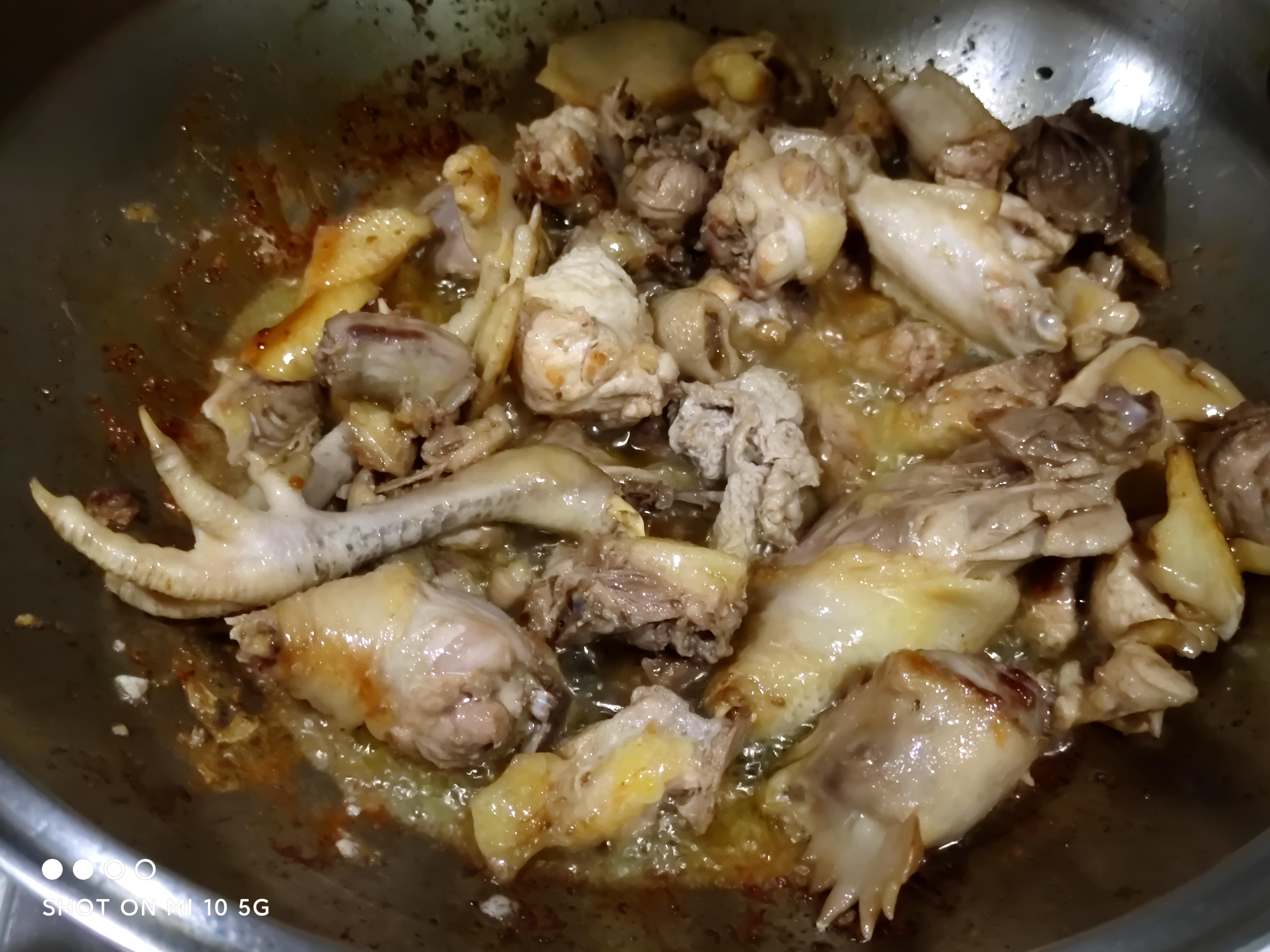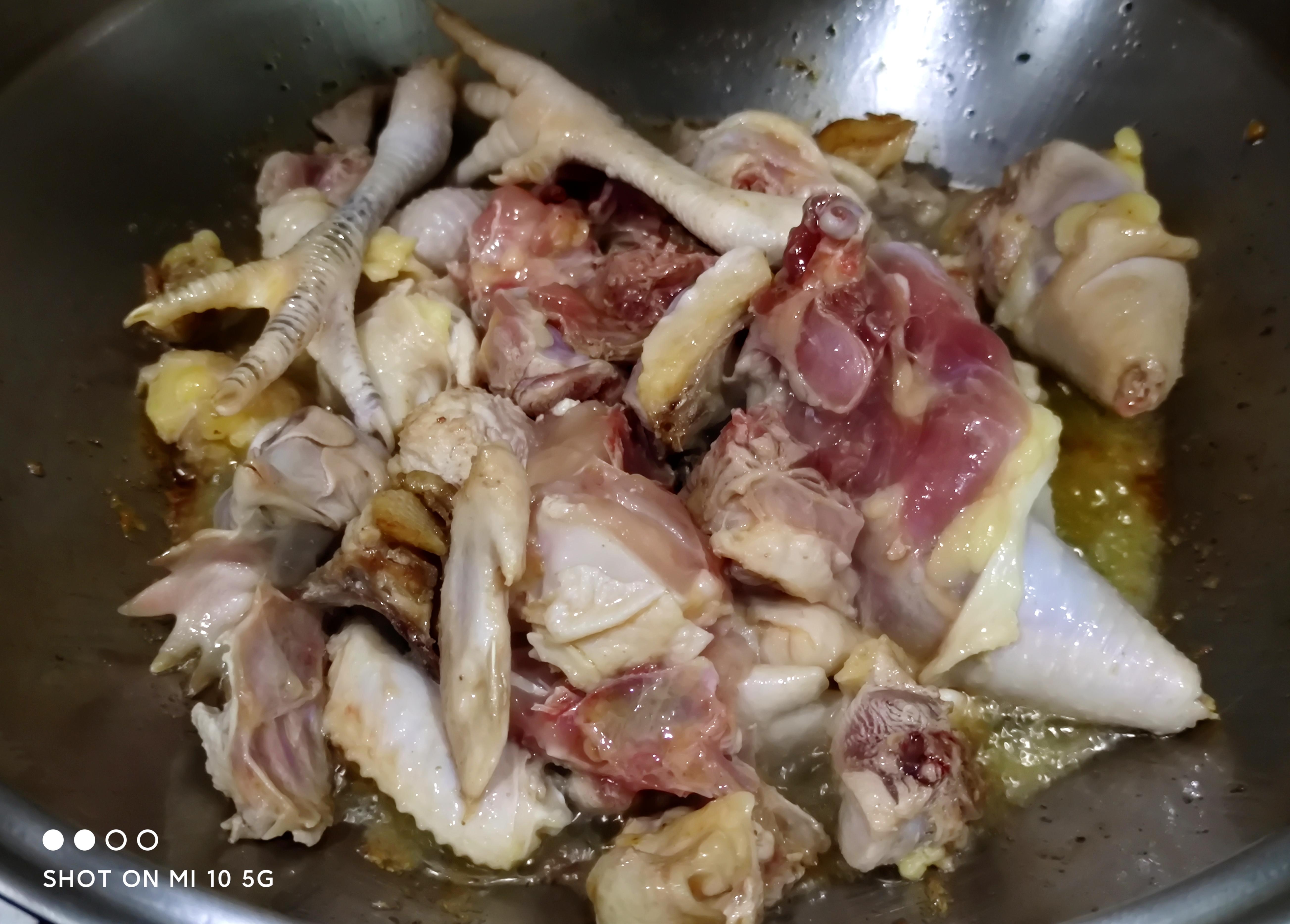 出油后下入鸡块,中大火煸炒金黄,微微发焦。