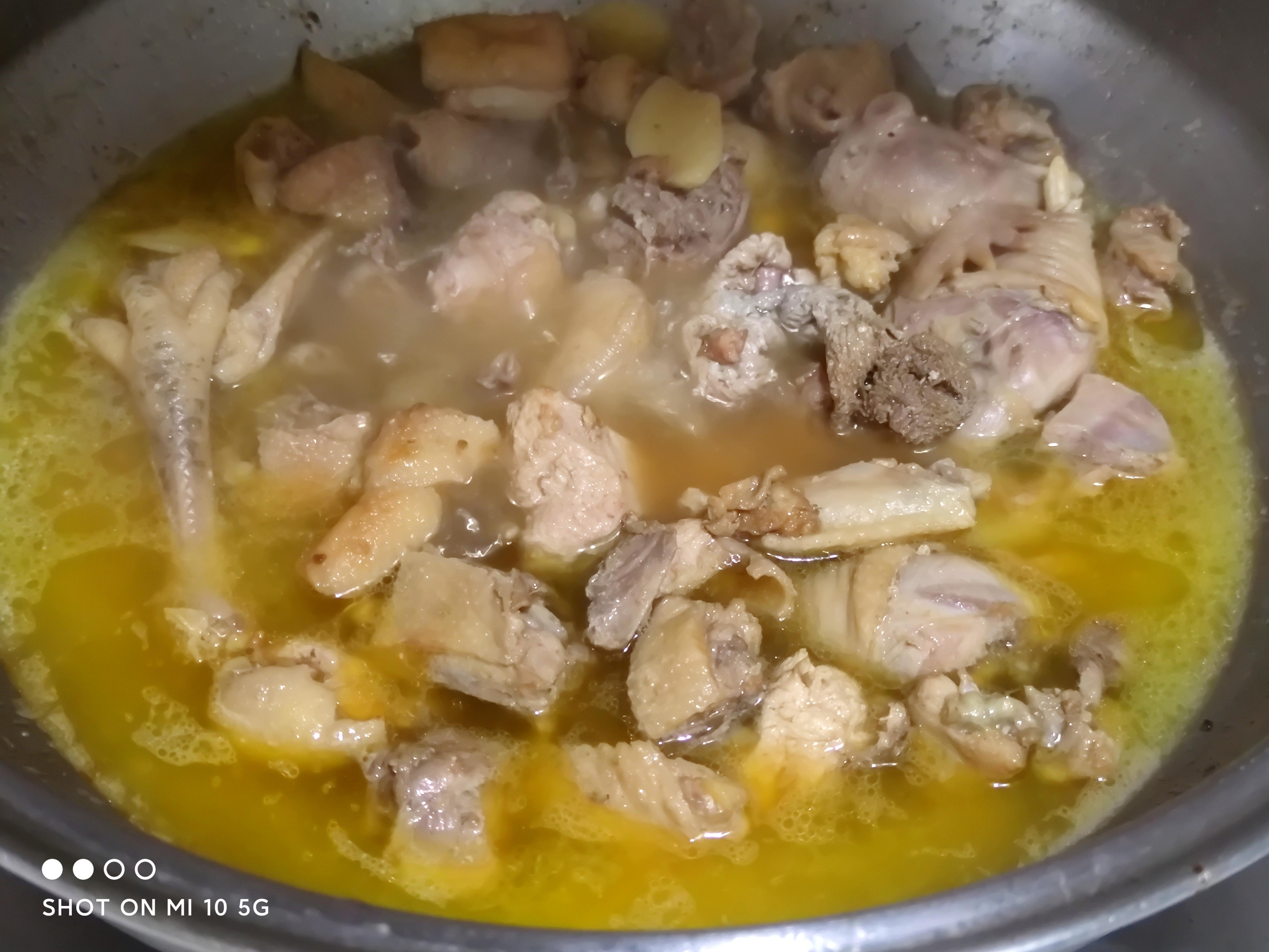 倒入开水,水多一些,没过鸡肉,我这只只因比较老,加水后大火烧开,转中火炖1小时。