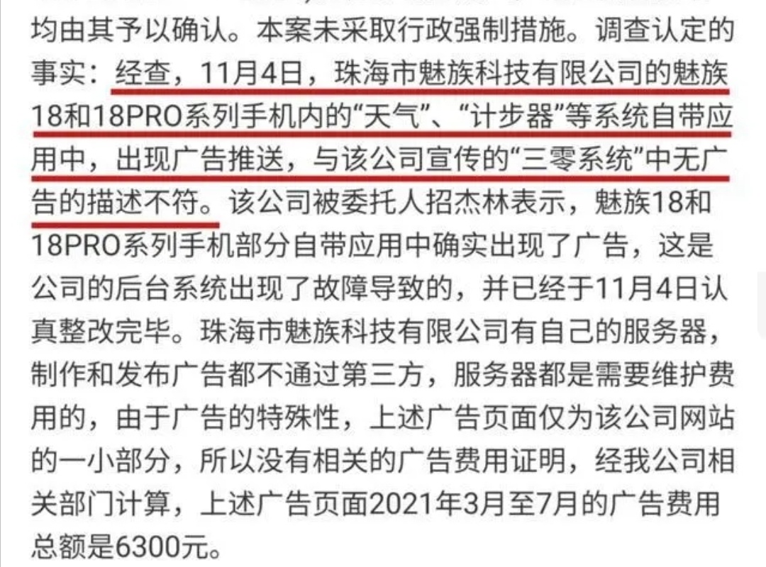 值得一提的是因爲無廣告這件事,魅族還被行政處罰過。魅族18pro違規添加天氣應用廣告非法獲利6300元。被人投訴,最後的處罰是2.52萬元,也就是廣告費用總額的4倍。