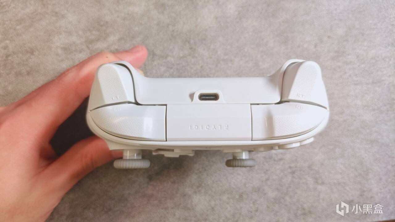 手柄的肩鍵與扳機都有着防滑紋路的設計,肩鍵採用的是輕觸開關按鍵,按壓聲音比較清脆。扳機則是採用的是高精度的霍爾線性搖桿,適合能夠自主且精確地控制汽車油門,用來遊玩地平線5等賽車類遊戲還是非常不錯的。
