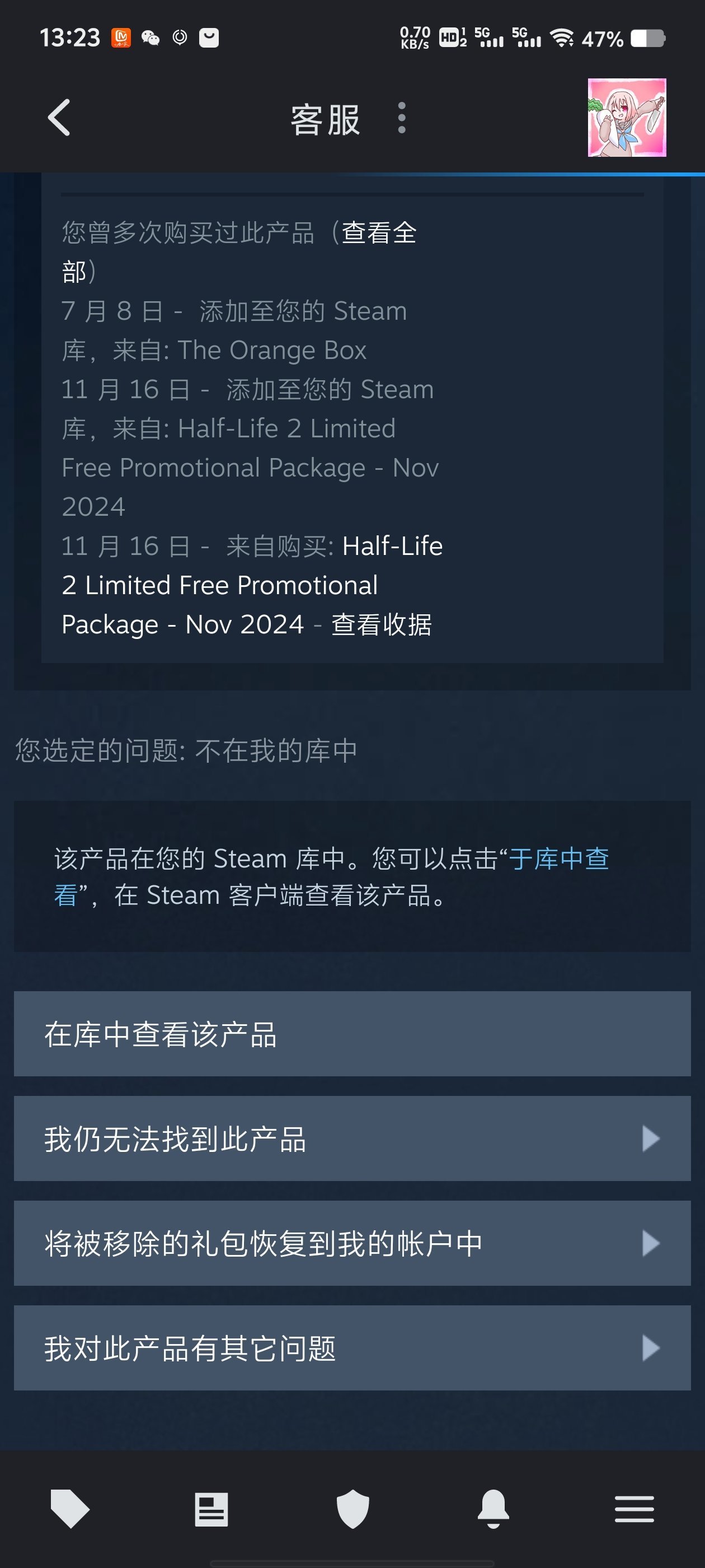 此時返回客服頁面,搜索half life2,分支問題選擇不在我的庫中,會出現如下圖所示的頁面,選擇將被移除的禮包恢復到我的賬戶即可。