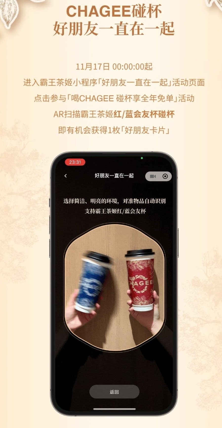 在小程序裏的活動界面用AR識別紅藍奶茶杯,就有機會得到一張好朋友卡牌