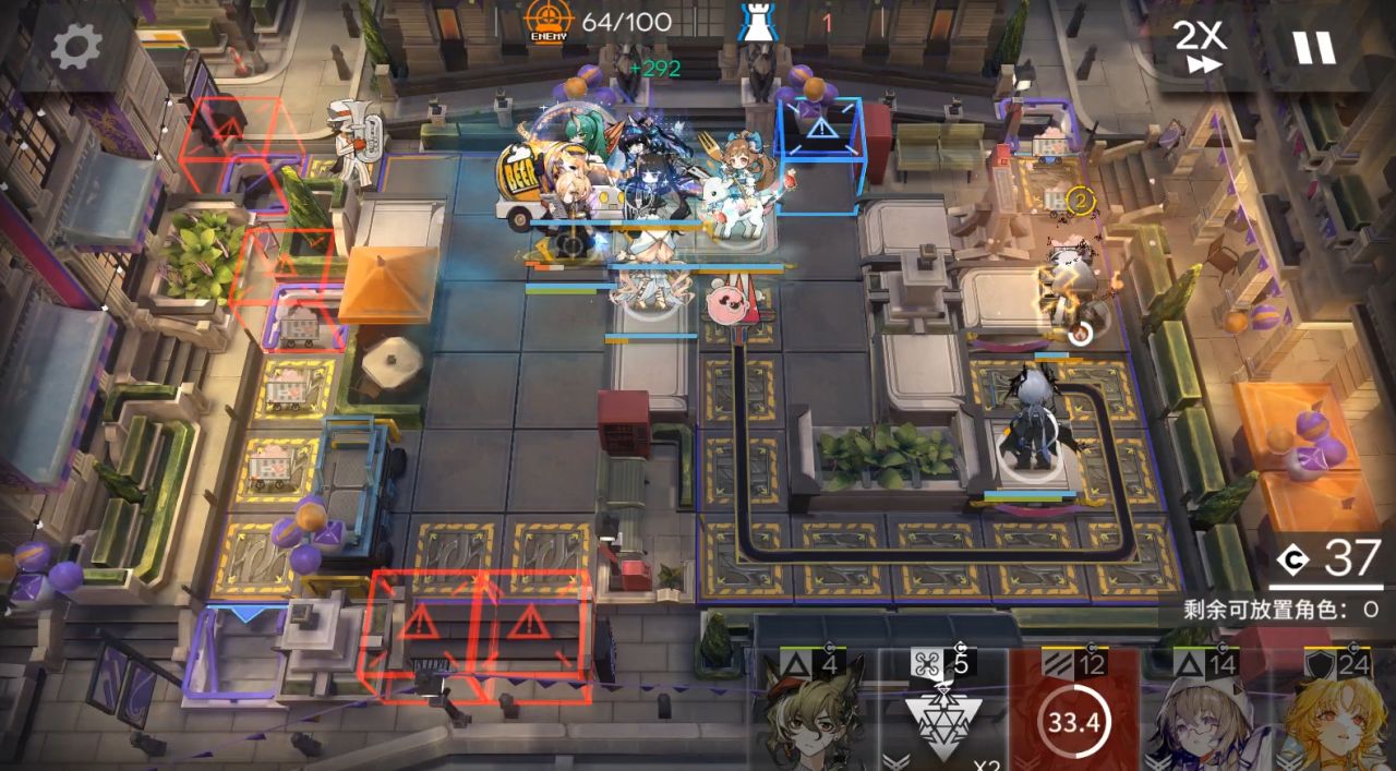在下图,2个减阻挡的怪来次时候开马恩纳技能,之后在马恩纳右下角一格放个箱子。后续马恩纳技能好了就开2次即可过关。