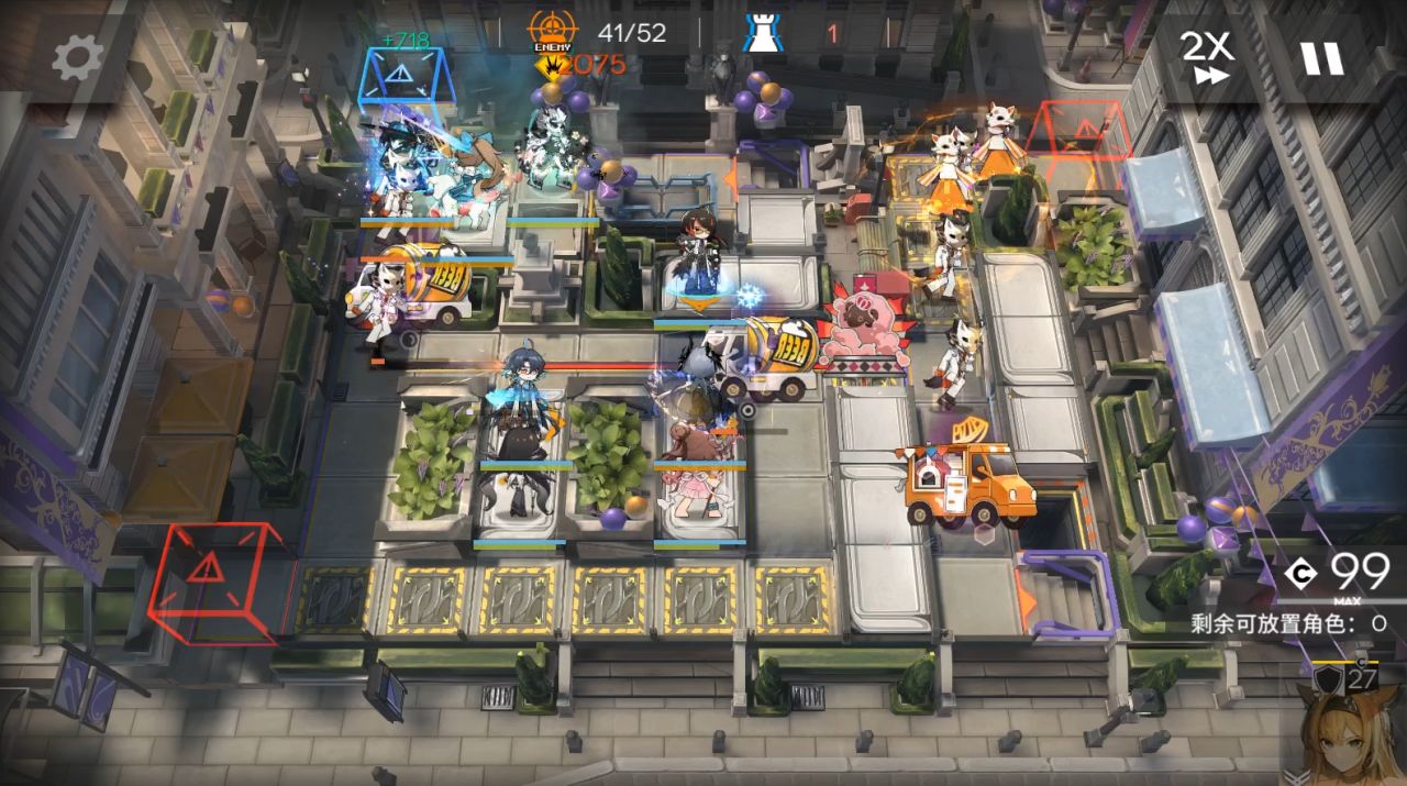 如果灵知没冰冻,下图最后2个减阻挡的怪塑心可能来不及,撤退小羊,放个重装阻挡或者减速地刺特种让塑心真伤打死。下面练度是第一个减阻挡的刚好在煌前面打死,第二个被冰冻了死的还早一点。突袭山那边的怪换成了挡3的,煌阻挡打死。