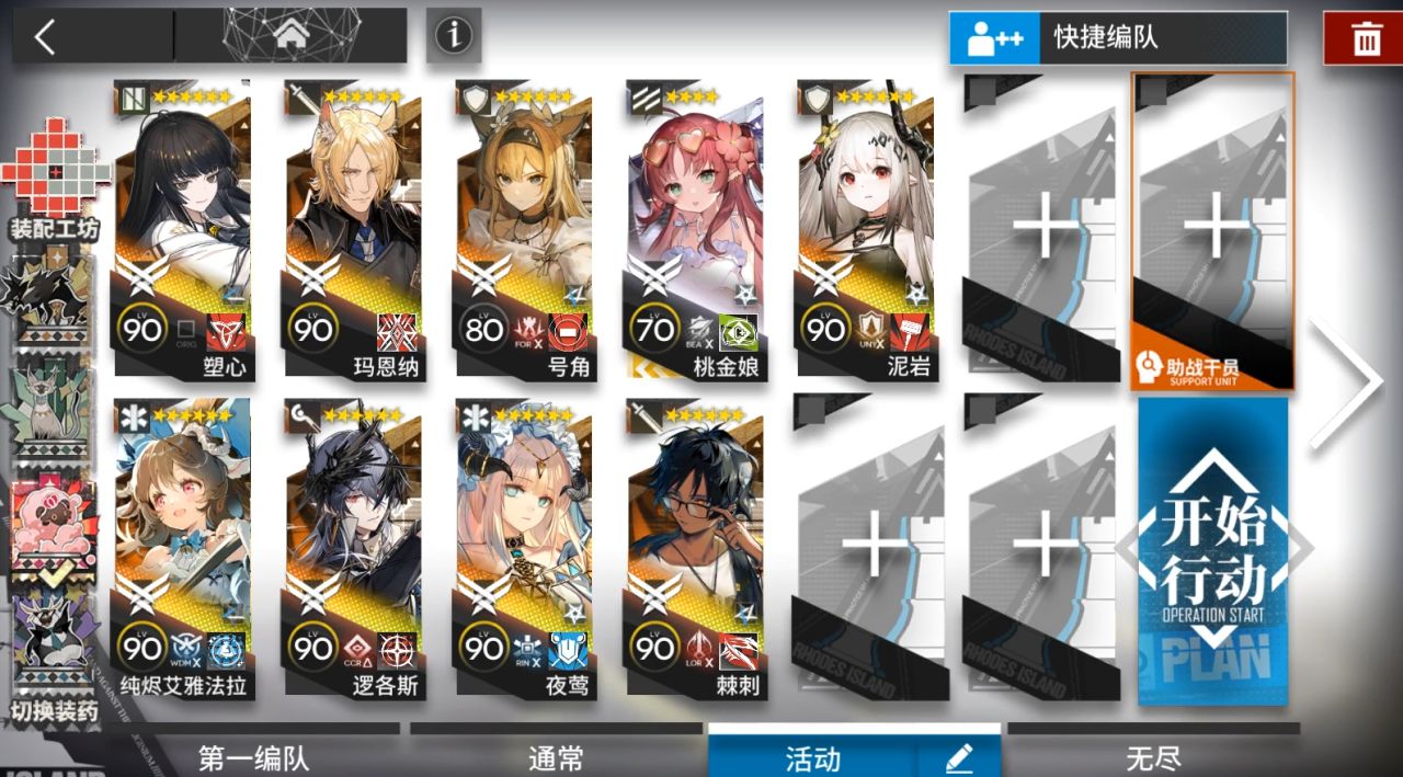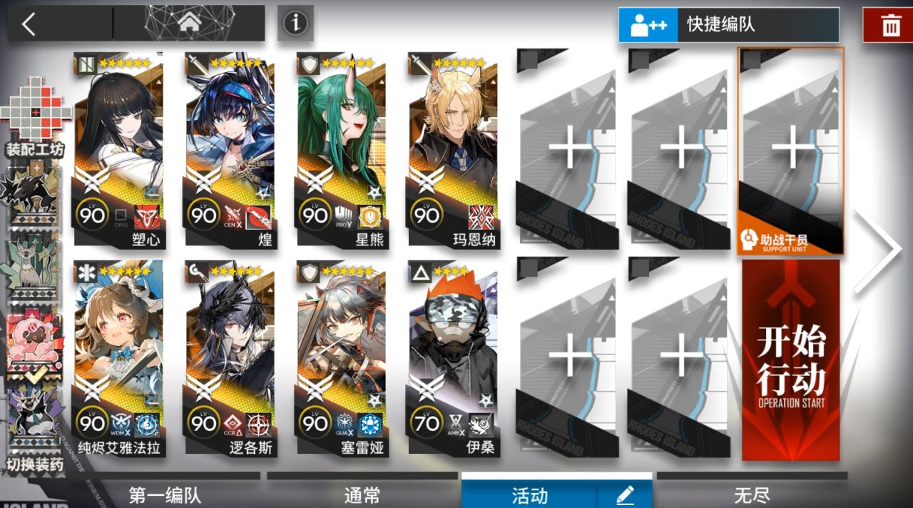 开1次马恩纳技能。塞雷亚换另外一个模组可以单守,这样lgs不用带,或者阿斯卡伦,或者露托。开局先锋在蓝门,奶羊朝左,塞雷亚,煌朝左,马恩纳朝左然后技能好了就开,后面挂机。夜莺朝上,lgs朝上,塑心朝左,星熊朝左。