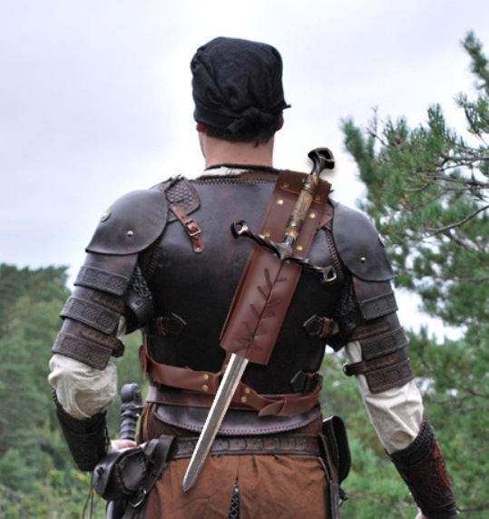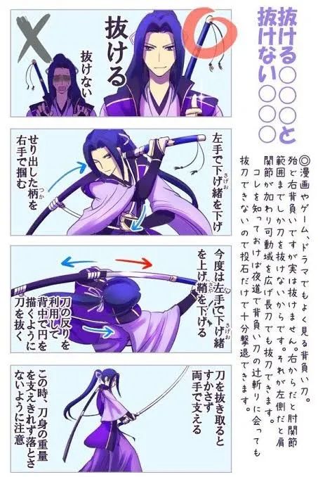 日本太刀倒是會連同刀鞘一起背在身後,但是拔刀時需要拉動揹帶,使刀柄處於和肩部呈直角的狀態才能順利取出刀身。