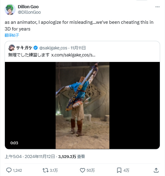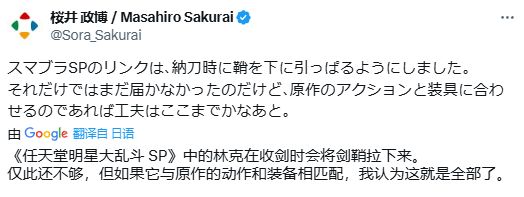 除此之外,Sakigake這段視頻也傳到了櫻井政博面前。據櫻井政博說,這讓他想起了自己過去開發《任天堂明星大亂鬥:特別版》處理林克動作時遇到的難題,他們特意爲此設計了一個細節:林克收劍入鞘時,會用輔助手將劍鞘稍微下拉。因此他也建議COSER在拔劍時,用另外一隻手拉住劍鞘。