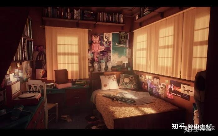 《艾迪芬奇的記憶》在質感方面則是讓人驚歎連連,根本壓抑不住瘋狂截圖的衝動,精雕細琢的光照和場景,在美麗的光照下細細品味場景裏多到離譜的細節,每一件物品都在訴說着一個角色的故事,甚至不同角色房間內的那一堆看得清書名的書都會時有不同,做飯的,地理的,電影的,小說的,去側面描寫每個角色的性格和故事。