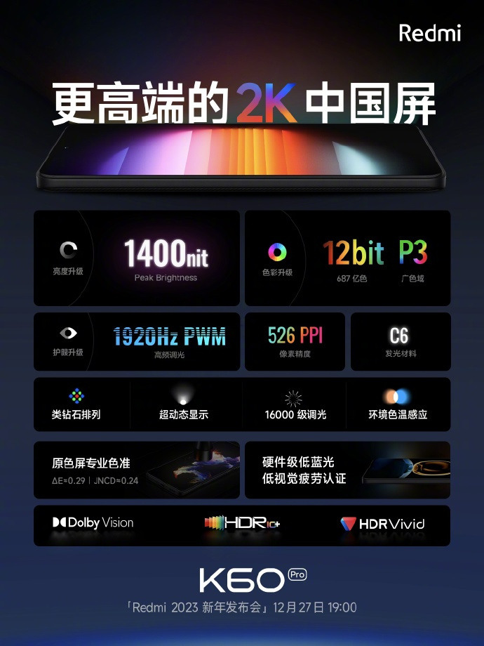 屏幕方面,Redmi K60 Pro 的 2K 屏幕将再度升级,支持 1400nit 高光峰值亮度,拥有 12bit / 687 亿色,支持全链路 P3 广色域,同时支持 1920Hz PWM 调光、硬件级低蓝光。